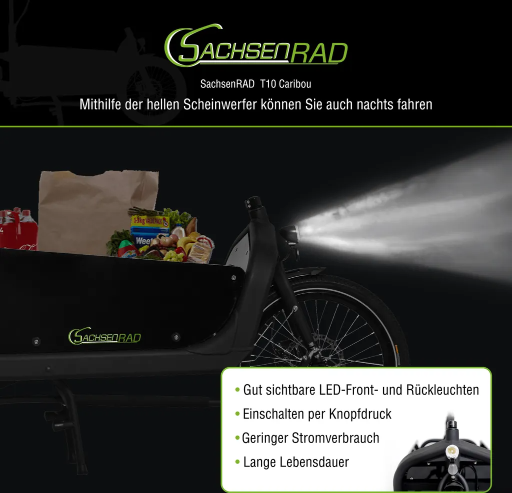 Das SachsenRAD E-Lastenrad T10 Caribou ist für den einfachen, sicheren und schnellen Transport konzipiert. Sie erreichen Ihre Ziel bequem, sind flexibel auf den Wegen und haben nun einen Begleiter, der Sie von jeder Last befreit. Durch das große Platz verstauen Sie Ihre Einkäufe und Gepäck spielend einfach. Sie werden schnell die Vorteile und Flexibilität des Cargo-Bikes gegenüber eines Autos erkennen und wertschätzen.